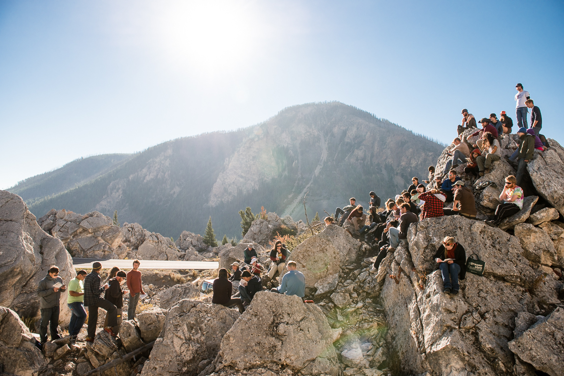 Students in the upper division science program Environmental Analysis gather on boulders for a reading of the play An Enemy of the People by Arthur Miller. The program spent a week at Yellowstone National Park studying geology and biology in an extreme environment.
