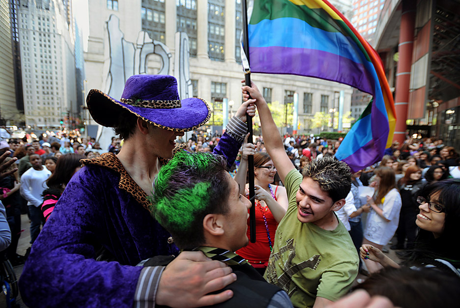 Mike Bielinski (from left), Ivan Saucedo and Anthony Calvillo dance together at the annual Night of Noise rally in downtown Chicago. The Night of Noise follows the Day of Silence protest in which LGBT youth take a daylong vow of silence to protest harassment of gay teens in schools.