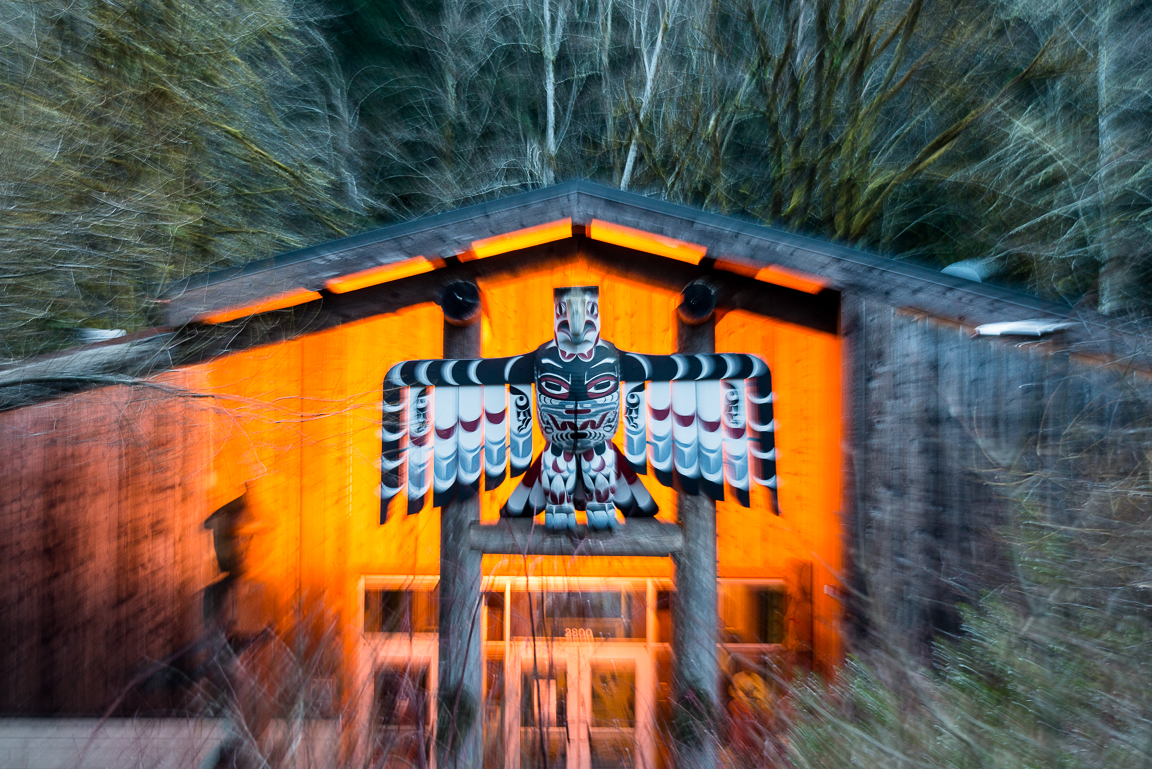 A Thunderbird carving by Greg Colfax and Andy Peterson adorns the door to The Longhouse Education and Cultural Center.