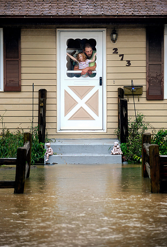 Doug Barton and granddaughter Amanda McNamara check out the rising water from the doorway of Barton's daughter-in-law's house on Martin St. in South Elgin, Il A broken levee caused the flooding water to reach levels two feet high in the neighborhood.