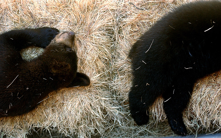 Orphaned black bear cubs "Kasha" and "Molly" nap in the moat of their pen after a busy morning of play at the San Antonio Zoo. The two cubs were born to different mothers, but play like siblings. "They don't know they're not related," said John Gramieri, Mammal Curator for the San Antonio Zoo.